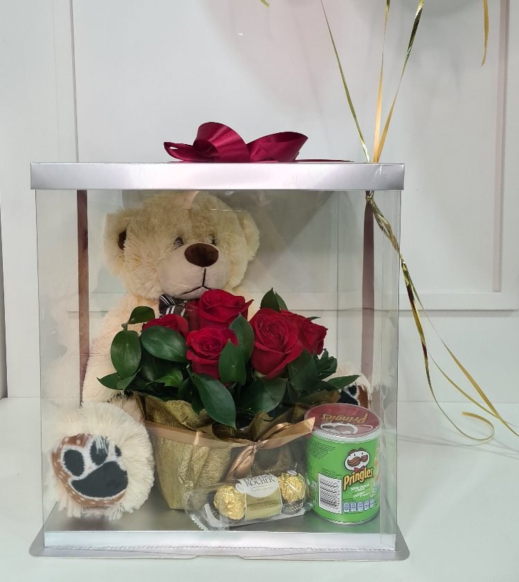 Caja de lujo pequeña con rosas y oso de chocolate
