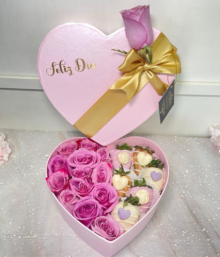 • Corazón de lujo pequeño con girasoles, rosas y fresas con chocolate