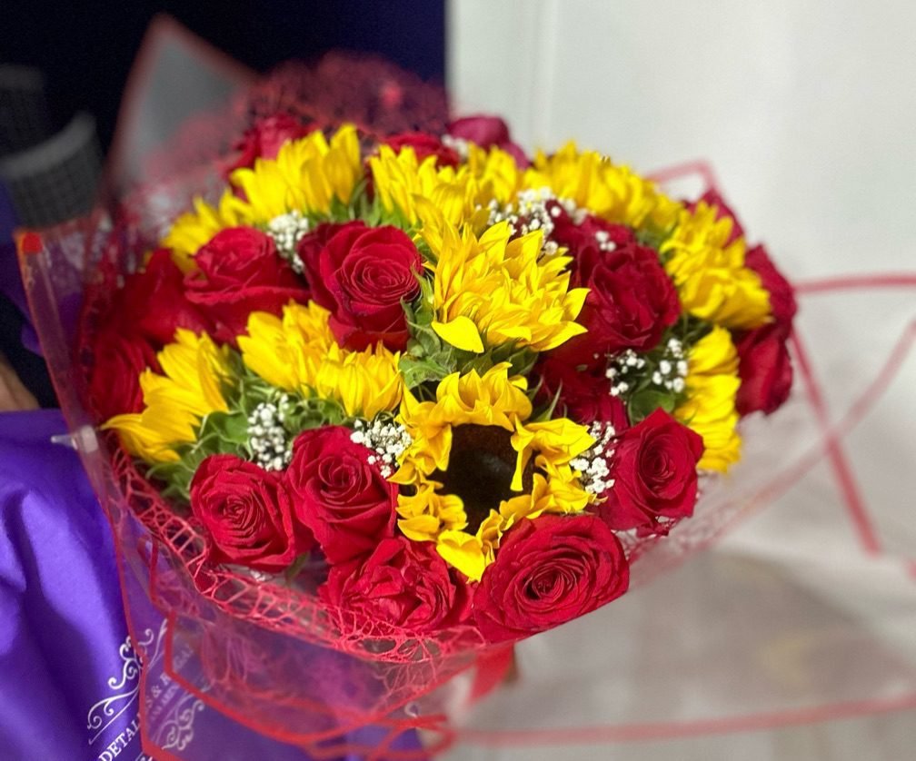 Sorprende a esa persona especial con un hermoso bouquet de girasoles y rosas frescas, cuidadosamente seleccionadas para expresar amor, alegría y ternura. Este arreglo floral es el detalle perfecto para aniversarios, cumpleaños o simplemente para alegrar el día de alguien con un toque lleno de color y sentimientos sinceros.