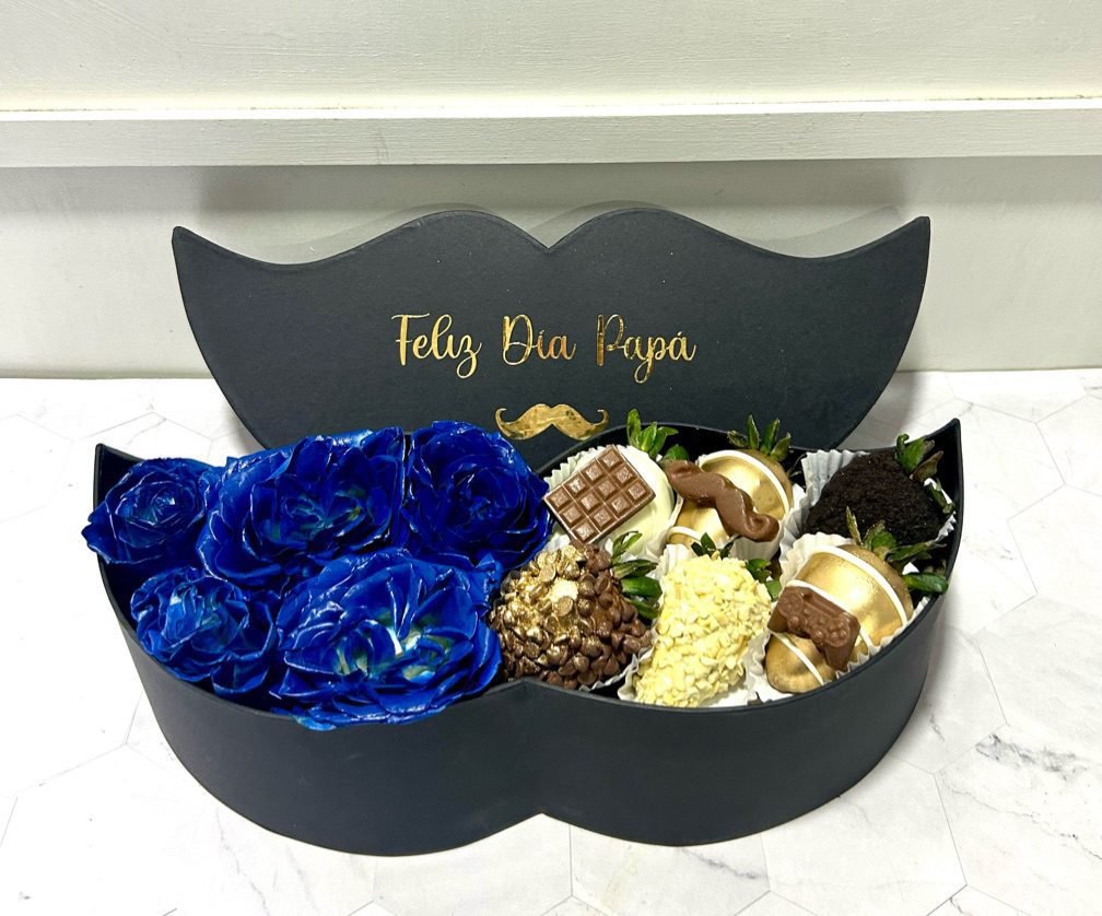 Caja luxury en forma de bigote que incluye Rosas naturales y fresas cubiertas con chocolate.