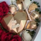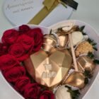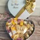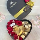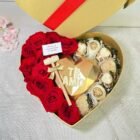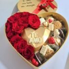 Caja corazón con corazón 3D chocolate, rosas, ferreros y fresas con chocolate
