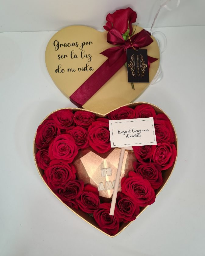 Caja Corazón de lujo, Corazón 3d chocolate y martillo con rosas