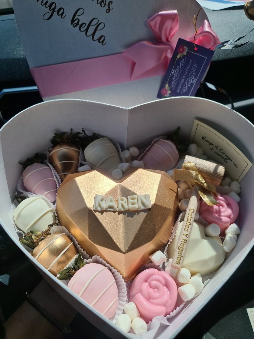 Su valor depende de los chocolates o elementos debajo del corazón. El corazón es a base de chocolate blanco, alrededor lleva 4 fresas y ferreros.