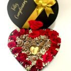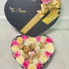 Caja de lujo corazón, con rosas, fresas con chocolate y corazón relleno