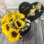 Una combinación encantadora de fresas cubiertas de chocolate, presentadas en una elegante caja con forma de corazón y decorada con girasoles.