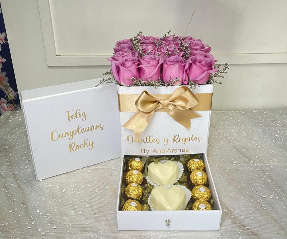 Un detalle que combina dulzura, belleza y elegancia en una sola presentación. Nuestra Caja de Lujo Floral gaveta incluye un delicado arreglo de flores acompañado de exquisitos rellenos de chocolate, creando el equilibrio perfecto entre encanto y sabor. Ideal para sorprender a esa persona especial y convertir cualquier ocasión en un momento lleno de amor y ternura.