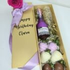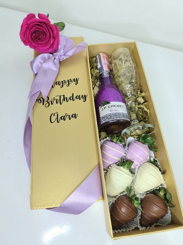 Una presentación elegante que incluye una botella de vino Jp Chenet de 200ml, una copa y fresas con chocolate. Ideal para celebraciones o como un regalo especial.