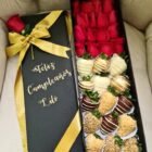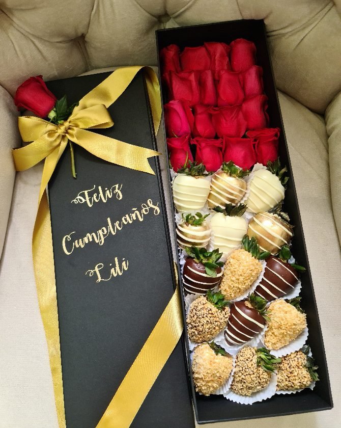 Una combinación elegante de fresas frescas y rosas, la caja de lujo Oslo es una opción sofisticada para cualquier ocasión. Las fresas están cubiertas con chocolate de alta calidad, creando un contraste perfecto entre la dulzura de la fruta y el rico sabor del chocolate.