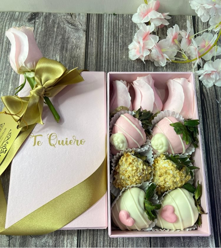 Una presentación elegante que combina fresas frescas cubiertas de chocolate con una delicada rosa. Ideal para regalos especiales o celebraciones.