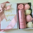 Una elegante caja de lujo que incluye una lata de J.P. Chenet, un chocolate relleno y fresas cubiertas de chocolate.