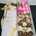 Una combinación elegante de rosas frescas, vino seleccionado y fresas cubiertas de chocolate. Ideal para ocasiones especiales, esta caja de lujo es un regalo que destaca por su sofisticación y sabor.
