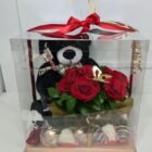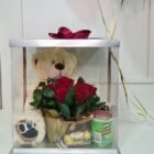 Una caja de regalo diseñada para enamorar a primera vista. Incluye un tierno oso de peluche de 35 cm que transmite cariño, un arreglo de rosas frescas que aporta elegancia y el toque dulce perfecto con chocolates o fresas. Un detalle ideal para sorprender en cualquier ocasión con delicadeza y estilo.
