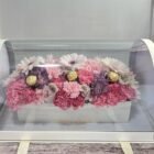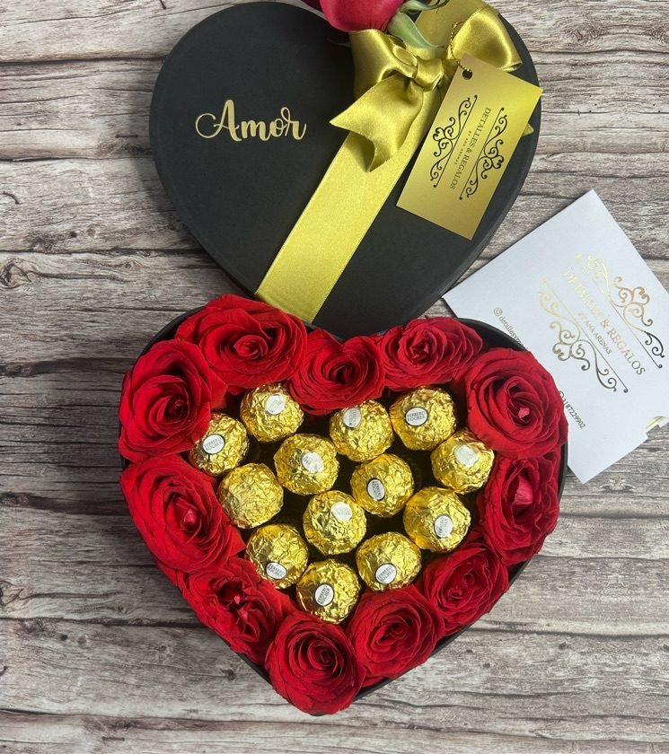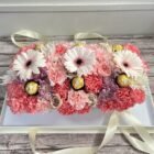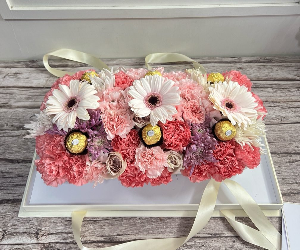 Un detalle pensado para iluminar cualquier día. Este cofre reúne la frescura de las gerberas, la textura suave de los claveles y el encanto atemporal de las rosas, formando una mezcla vibrante y llena de color. Los chocolates Ferrero Rocher complementan el arreglo, creando un regalo completo, dulce y visualmente encantador.