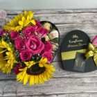 Corazón de lujo pequeño con girasoles, rosas y fresas con chocolate