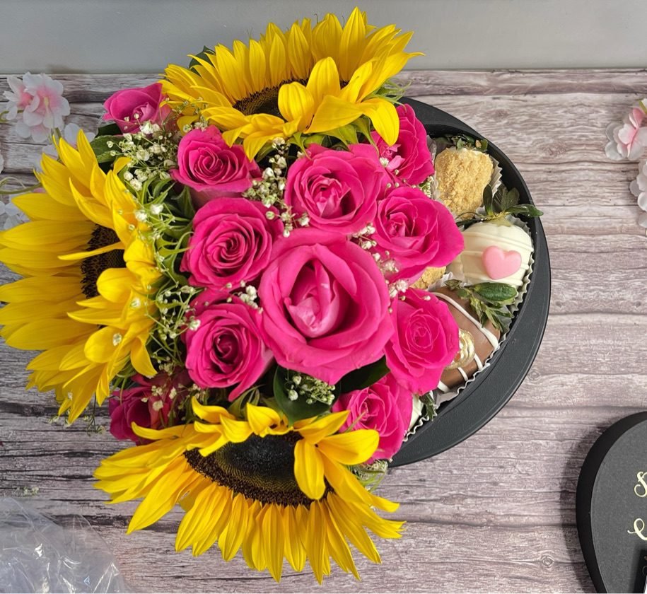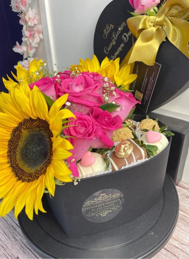 Este corazón de lujo pequeño combina la luz de los girasoles, la elegancia clásica de las rosas y la dulzura irresistible de las fresas con chocolate, creando un detalle equilibrado y encantador. Cada elemento está dispuesto con cuidado para ofrecer una presentación hermosa, fresca y llena de significado.